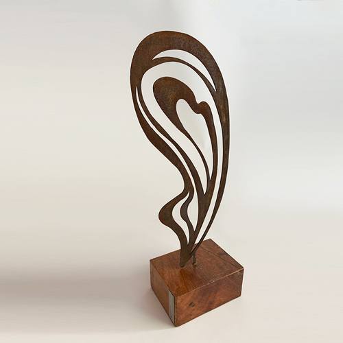 Aço cortem e base em madeira Cedro Base: 15x10x7 cm. Altura: 47 cm Largura: 15cm